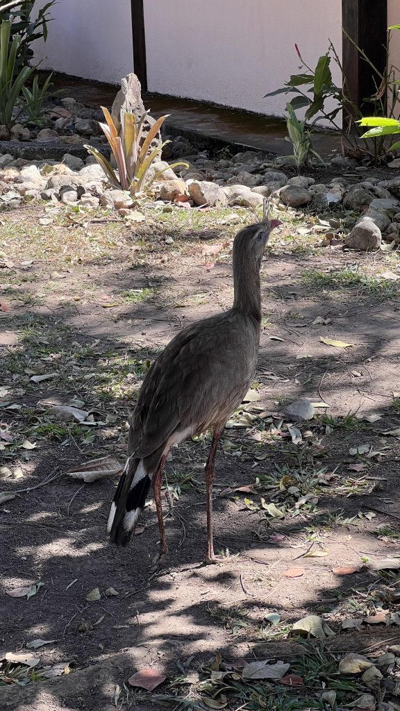 Entre os animais mais facilmente avistados, a seriema costuma cruzar o caminho dos visitantes de forma elegante e curiosa, mostrando por que é um dos símbolos do Cerrado.